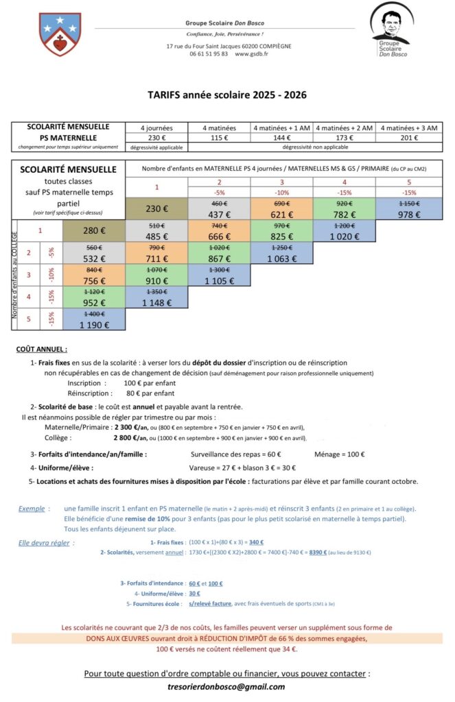 Les nouveaux tarifs pour la rentrée de septembre 2026 seont publiés en avril, avec une faible hausse de scolarité de cinq euros seulement (~ 2 %), qui assure que nulle famille n’est empêchée de bénéficier de notre école, de son exigence pédagogique, de sa bienveillance et de son professionnalisme.